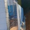 Cercamento com base de concreto, tubos de ferros galvanizado e pintura eletrostática. Tela soldada revestida em PVC verde.